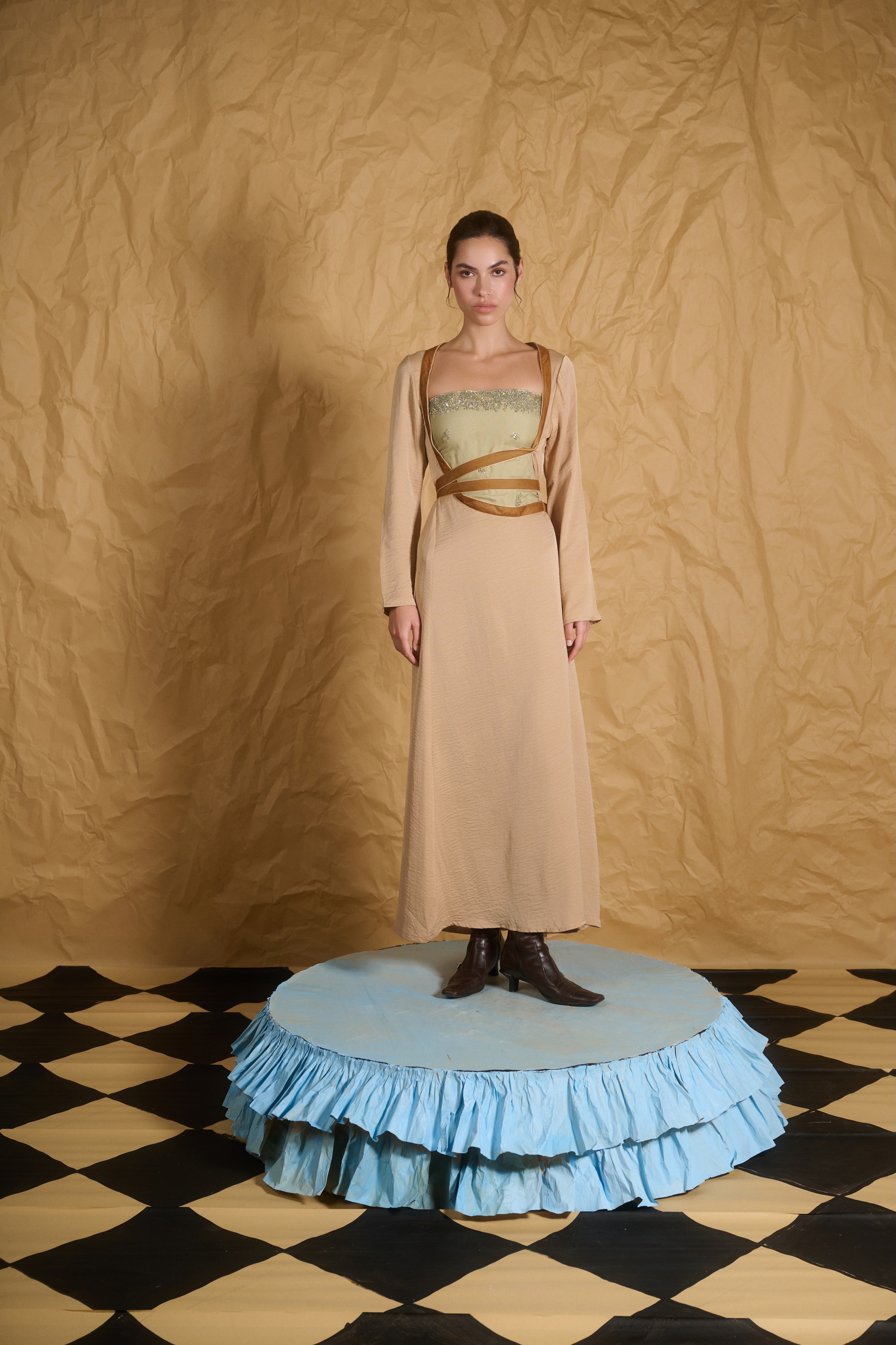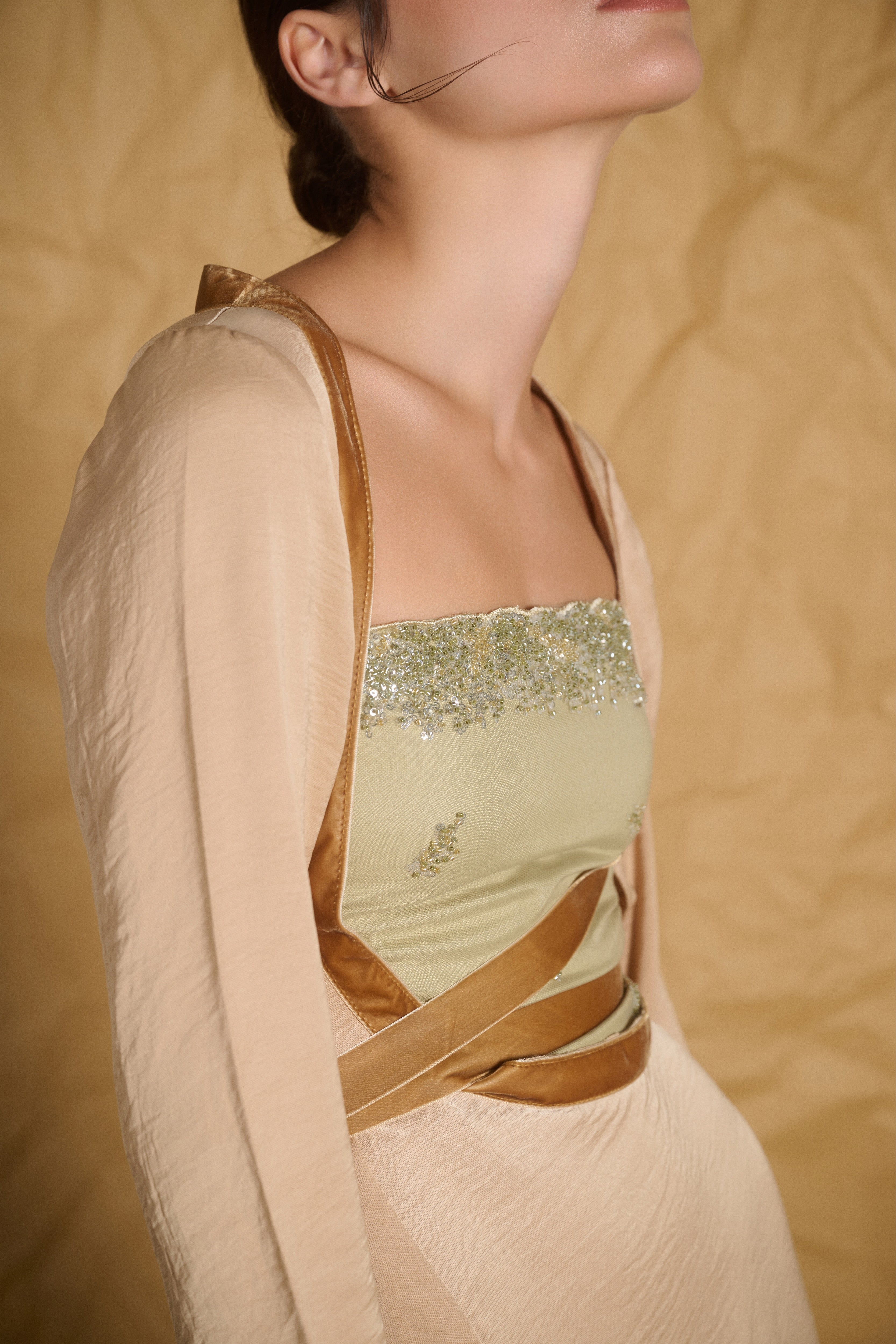 This luxurious two-piece kaftan is crafted from soft crepe butter yellow fabric, offering an effortless flow with a touch of elegance. The deep-U opening beautifully highlights the embellished beaded smocked bodice tube top, adding a sophisticated sparkle. A velvet ribbon delicately wraps around the torso, creating a rich textural contrast. The ribbon not only enhances the design but allows for a personalized fit, accentuating the waist and flattering the overall silhouette. Perfect for formal gatherings or evening events, this kaftan embodies both style and comfort.
