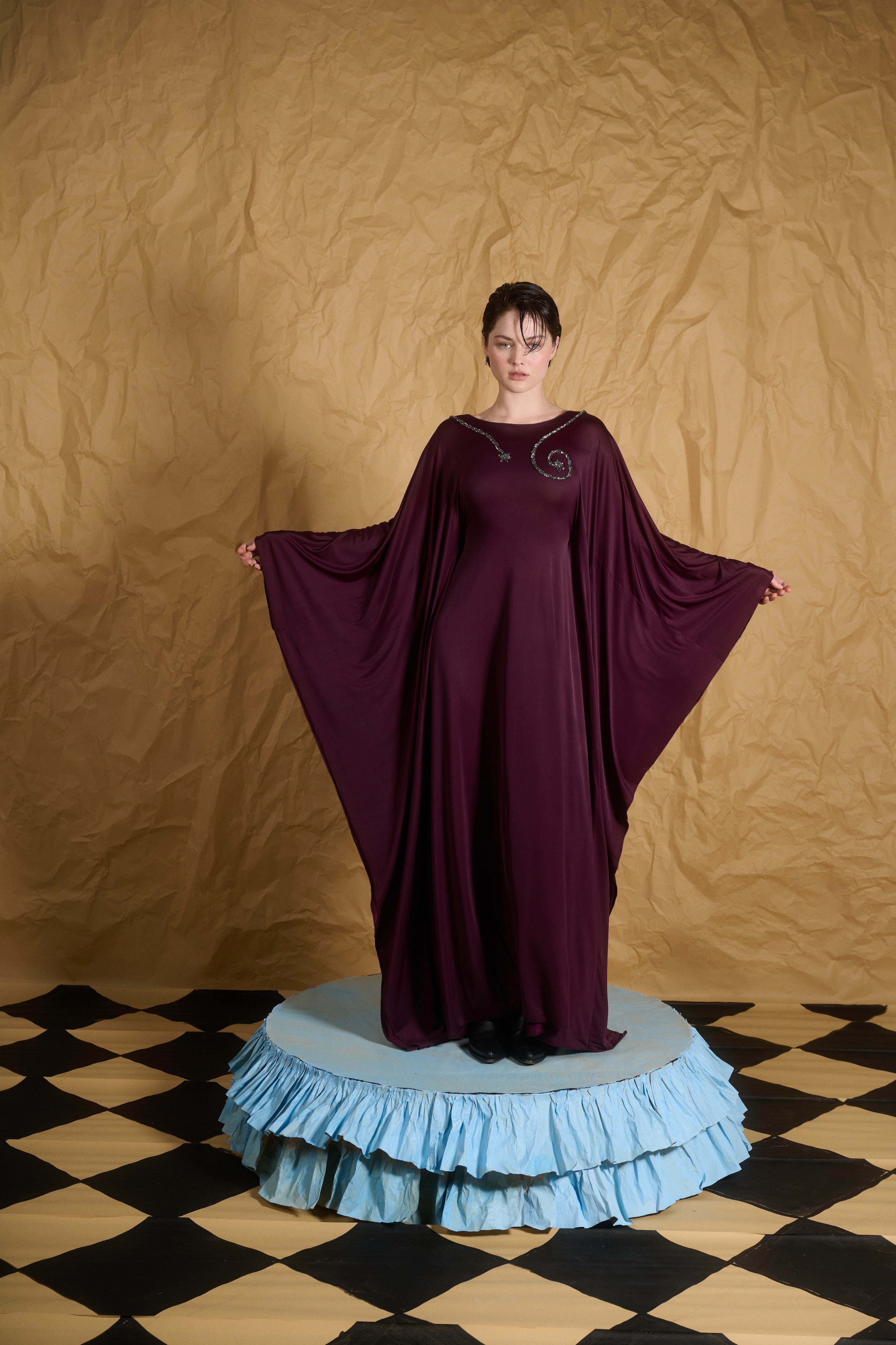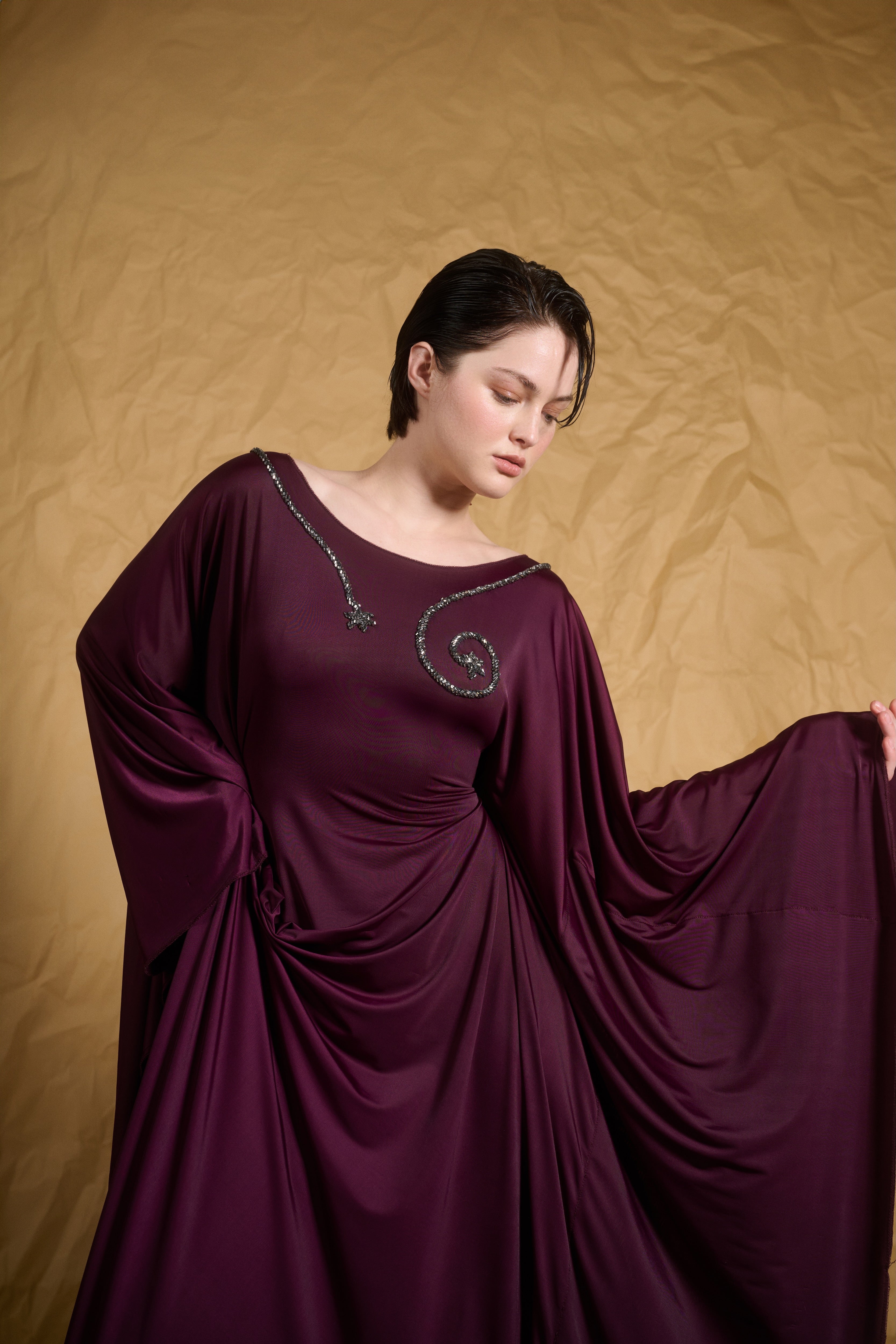 This mesmerizing maxi dress combines luxurious simplicity with exquisite detailing. The deep purple fabric drapes elegantly, creating a flowing silhouette. The dress features wide, dramatic sleeves that billow out, adding a sense of grandeur. At the neckline, a sparkling beaded spiral design adds a subtle touch of opulence. The dress is crafted from soft, stretchy fabric for comfort, with an internal belt that cinches at the waist, creating a flattering, feminine shape. Perfect for any occasion where elegance and comfort are paramount.