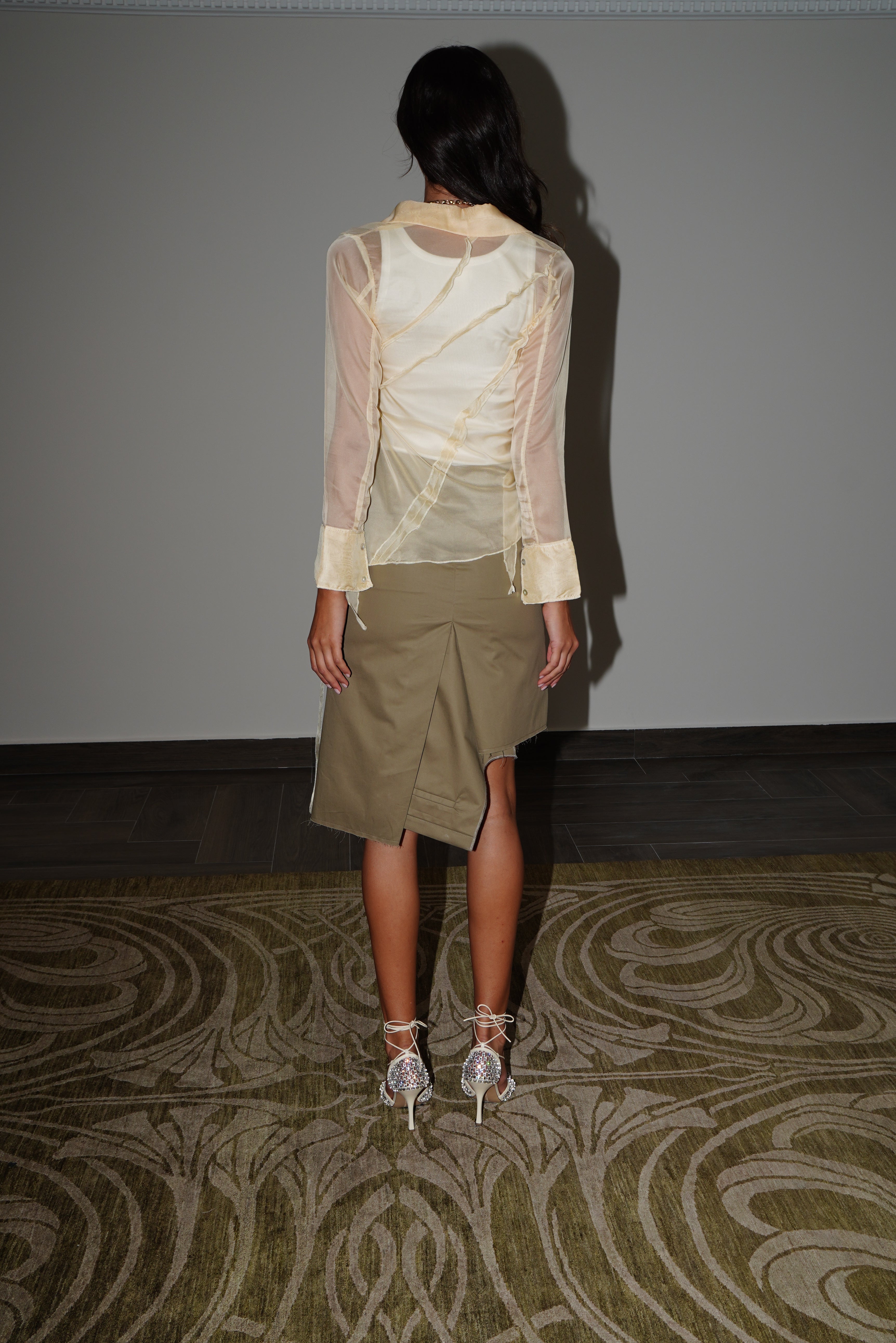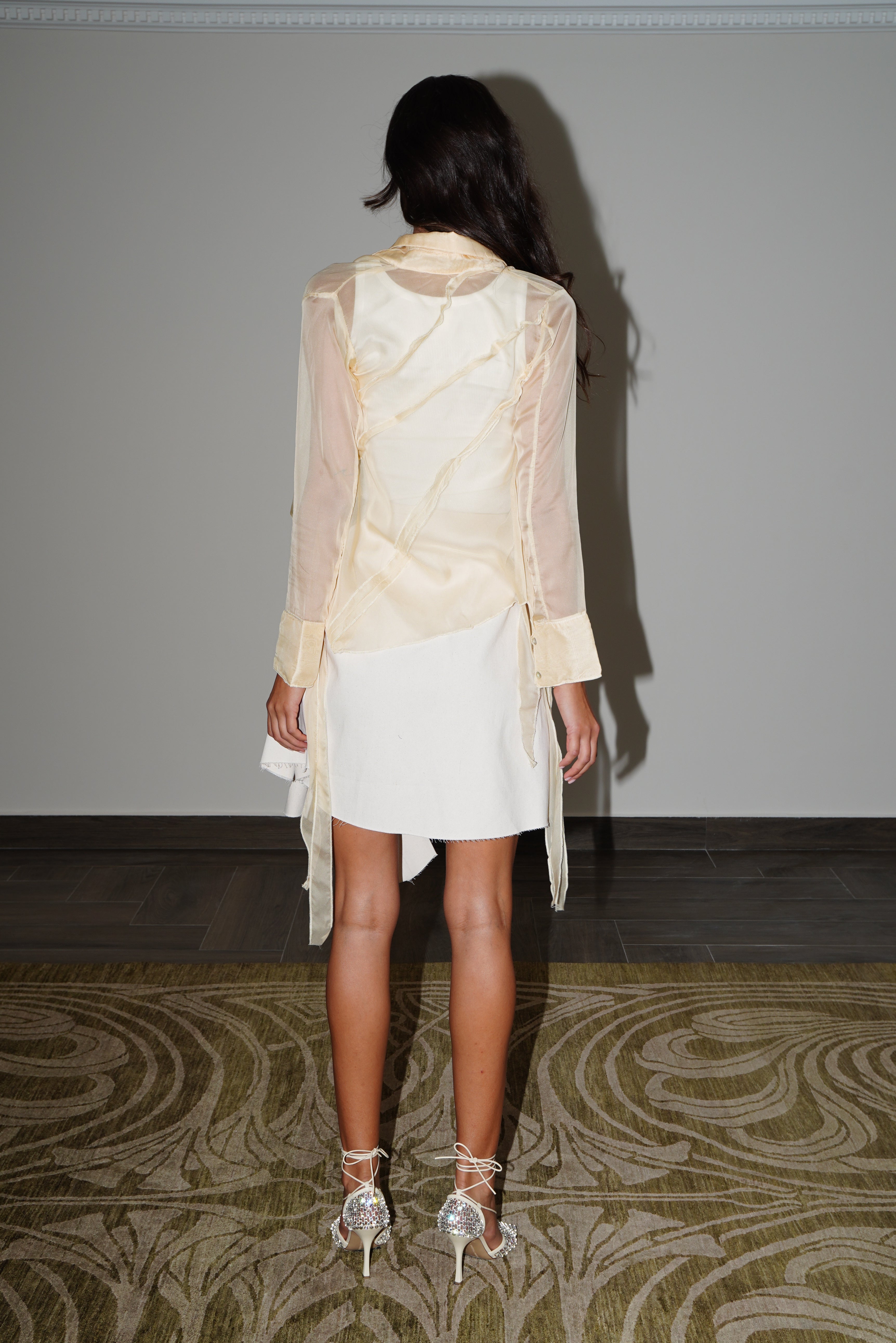 Silk-chiffon Vienna shirt is woven with asymmetric ruffles, an exaggerated point collar and a wrap front that cinches the waist.